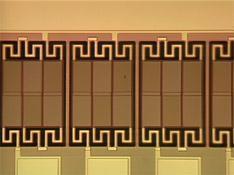 It consists of a two-layer structure. An interconnecting readout circuitry is applied to the silicon process wafer and then the microbolometer structure is built on top of the readout circuitry. First a pattern of islands _ wavelength thick are deposited on the readout circuitry. The islands are made of a material that can be selectively etched away later to form a bridge structure. Three layers -- silicon nitride, vanadium oxide, and silicon nitride -- are deposited over the sacrificial islands. The sacrificial islands are then etched away leaving the thermally isolated bridge structure of vanadium oxide. A photo of an early Honeywell microbolometer element is shown in the picture below followed by a photo of one corner of a 320 by 240 microbolometer array
